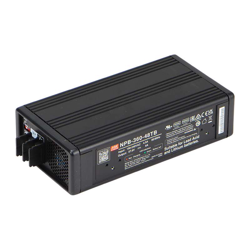 NPB-360 series is a 360W charger compatible with lead-acid (Flooded, Gel, AGM) and Li-ion (Lithium Iron, Lithium Manganese) batteries. This product is a Class I power unit (with FG), equipped with a standard IEC 320-C14 AC inlet and two or three-stage charging control. The entire series offers different models with output voltages ranging between 10.5VDC and 60.8VDC, which can satisfy the demands of various types of battery devices.