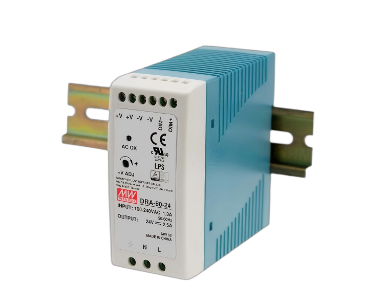 DRA is a 40-60W AC/DC DIN rail power supply, featuring adjustable output current. Users are able to easily change the constant output current level via 1~10VDC, PWM signal, or resistance. The DRA can be mounted on DIN rail TS-35/7.5 or 15; in addition, the width of the unit is only 40mm, making it well-suited for installation in limited spaces. DRA accepts universal AC input between 90VAC and 264VAC. With efficiency of up to 87%, the entire series can operate under free air convection from -30°C to 70°C.