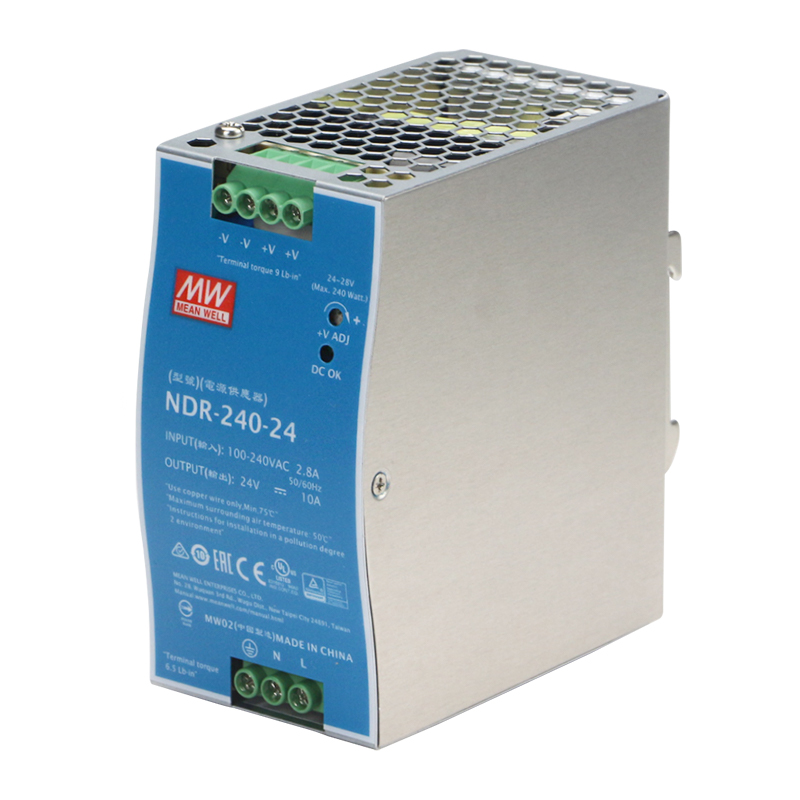 NDR is an economical slim 75-480W DIN rail power supply series, designed to be installed on TS-35/7.5 or TS-35/15 mounting rails. The body is designed to be 63mm in width, which allows for space-saving inside the cabinets. The entire series adopts a full-range AC input from 90VAC to 264VAC and conforms to BS EN/EN61000-3-2, the norm the European Union regulates for harmonic current. The NDR is designed with a metal housing that enhances the unit's power dissipation. With working efficiency of up to 90%, the entire series can operate at ambient temperatures between -20°C and 70°C under air convection. It is equipped with a constant current mode for overload protection, fitting various inductive or capacitive applications. The complete protection functions and relevant certifications for industrial control apparatus (UL508, TUV, BS EN/EN62368-1, etc.) make the NDR a very competitive power supply solution for industrial applications.